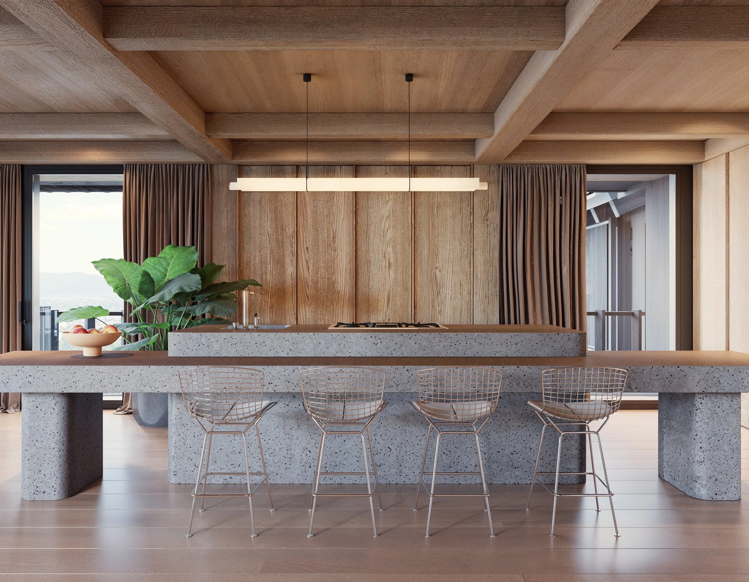 Inside, the wooden-clad interiors create a warm and inviting atmosphere, enhanced by the open floor plan that exudes a sense of spaciousness.